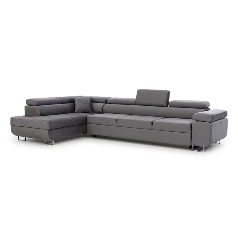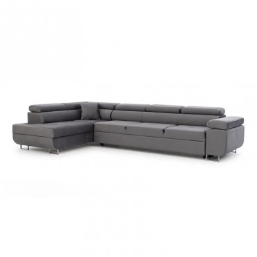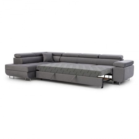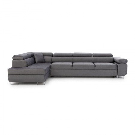 Narożnik Annabelle Maxi to elegancki i nowoczesny mebel wypoczynkowy, zaprojektowany z myślą o przestronnych wnętrzach, w których liczy się zarówno estetyka, jak i wygoda użytkowania. Połączenie minimalistycznej formy z wysokiej jakości materiałami sprawia, że model ten doskonale wpisuje się w charakter współczesnych salonów. Chromowane, srebrne nóżki dodają konstrukcji lekkości i nowoczesnego wyrazu, a możliwość wyboru koloru i faktury tapicerki umożliwia łatwe dopasowanie narożnika do różnorodnych aranżacji. Konstrukcja oparta na solidnym, drewnianym stelażu gwarantuje trwałość i stabilność mebla przez długie lata. Wypełnienie siedziska ze sprężyn falistych oraz pianki poliuretanowej, zapewnia odpowiedni poziom elastyczności i komfortu. Regulowane zagłówki umożliwiają dopasowanie wysokości podparcia głowy i karku, zwiększając ergonomię codziennego wypoczynku. Model Annabelle Maxi został wyposażony w funkcję spania, która pozwala w prosty sposób przekształcić narożnik w pełnowymiarową powierzchnię do snu o wymiarach 263x124 cm.