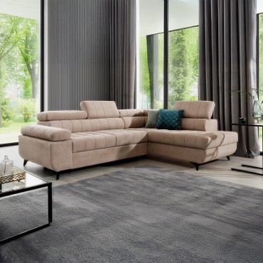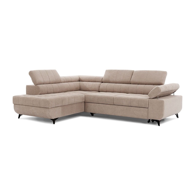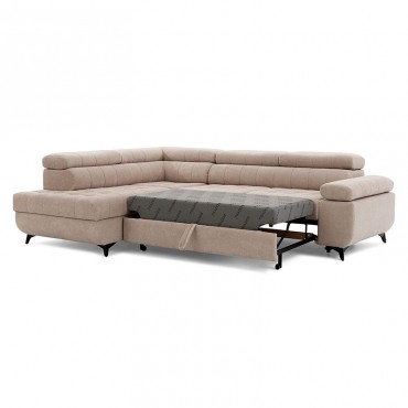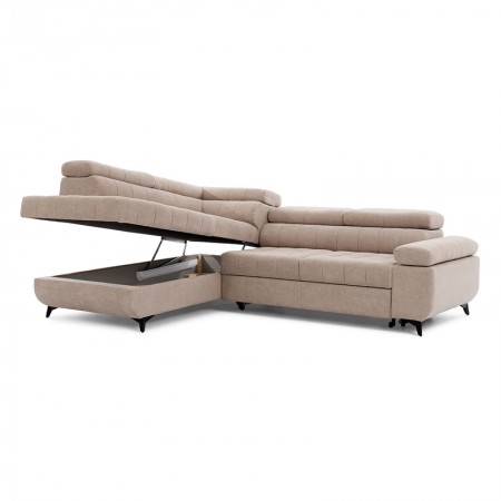 Rozkładany narożnik z pojemnikiem na pościel i regulowanymi zagłówkami.