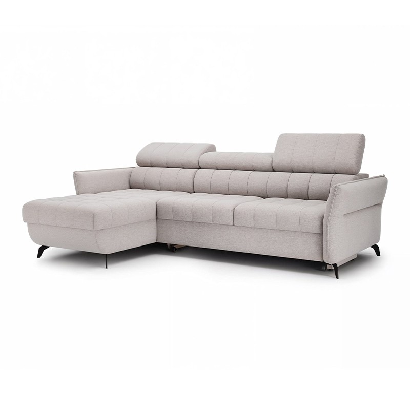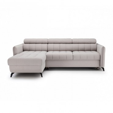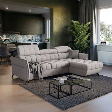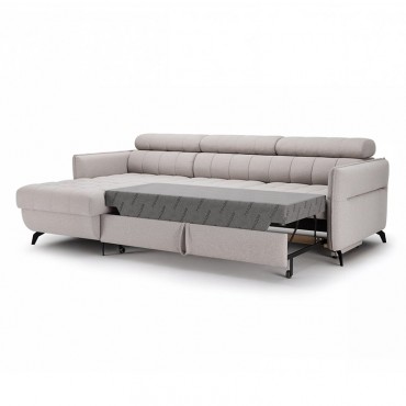 Kompaktowy rozkładany narożnik z pojemnikiem na pościel. Wyposażony w regulowane zagłówki.