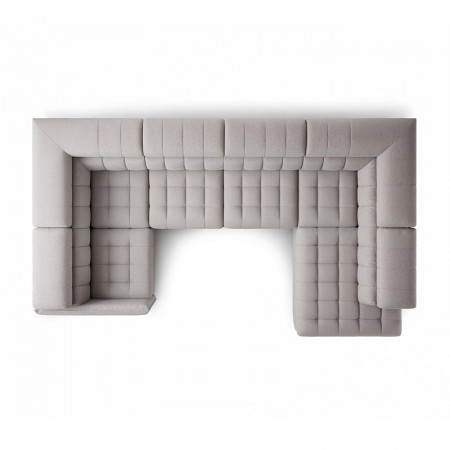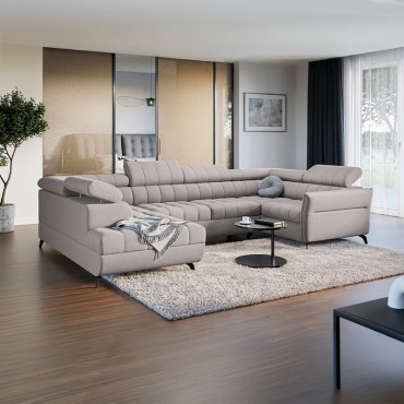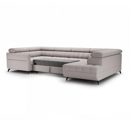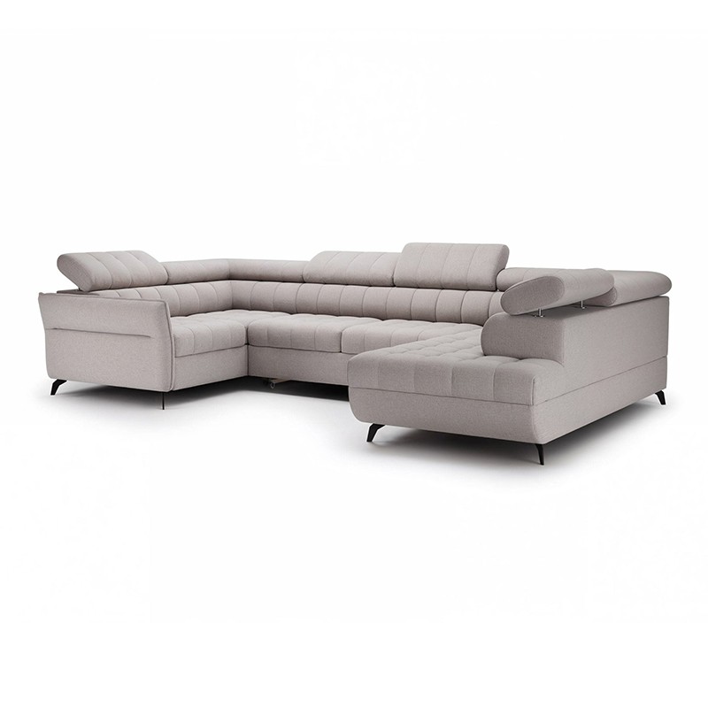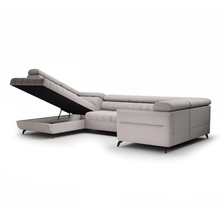 Nowoczesny rozkładany narożnik w kształcie litery U z regulowanymi zagłówkami i pojemnikiem.