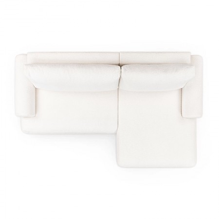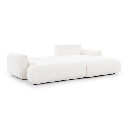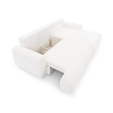 Elegancki narożnik Lotulis Mini w kremowej dzianinie łączy styl, wygodę i funkcję spania z praktycznym pojemnikiem na pościel. Szer. 264 cm; wys. 84 cm; gł. 163 cm. Powierzchnia spania: 213x141 cm.